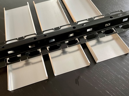 Panele do systemów sufitów metalowych z otwartymi złączami są wykonane z walcowanej taśmy aluminiowej. Stop to ALMn 0,5 Mg 0,5 H 44-48, przetwarzany zgodnie z EN 13523 (patrz arkusz danych) lub anodowany na wysoki połysk z AL 99.85 (twardy), nadający się do walcowania. Panele sufitowe są profilowane w procesie formowania rolkowego.