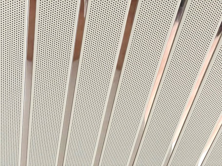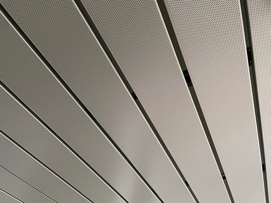 Aluminiowe sufity z otwartym złączem są dostępne z gładką lub perforowaną powierzchnią